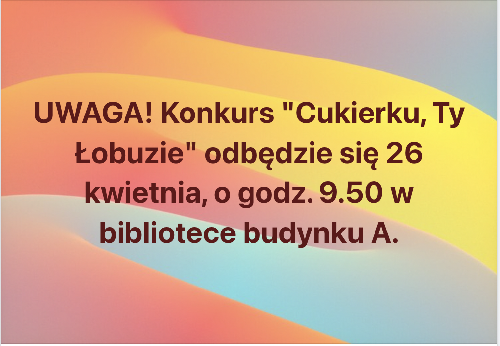 26 kwietnia o godz. 9:50 w bibliotece szkolnej w budynku A odbedzie sie konkurs pod hasłem "Cukierku, ty łobuzie". Już nie możemy się doczekać!