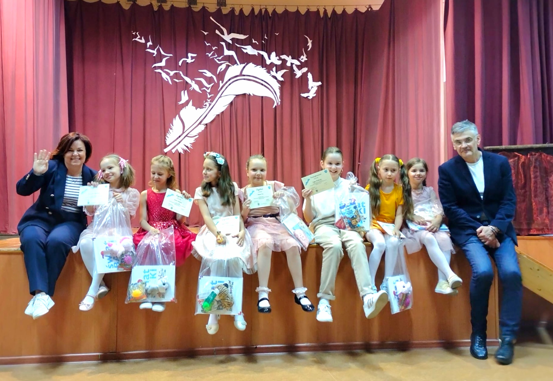 We wtorek 30 maja, w auli naszej szkoły gościliśmy finalistki Artystycznego Przeglądu Aktorsko-Recytatorskiego "Skrzydlate słowa". Na scenie wystąpiły uczennice Szkoły Podstawowej nr 6 w Cieszynie: Martyna Gazurek, Weronika Matloch, Sonia Stoszek oraz reprezentantki Jedynki czyli Marta Długi, Oliwia Pac oraz Maja Pilch. Całość spotkania z poezją poprowadziła Zofia Palimąka, uczennica klasy 3b. Wszystkie uczestniczki otrzymały pamiątkowe upominki, a spotkanie zakończył quiz obrazkowy dla wszystkich obecnych - i tych młodszych i starszych.